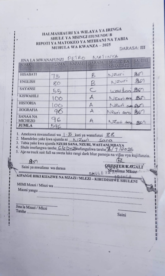 Felicità. Ricordate Petro? Grazie all' aiuto di don Carlo è stato inserito nella scuola del suo villaggio (Pawaga) e vive con suo padre una vita dignitosa.